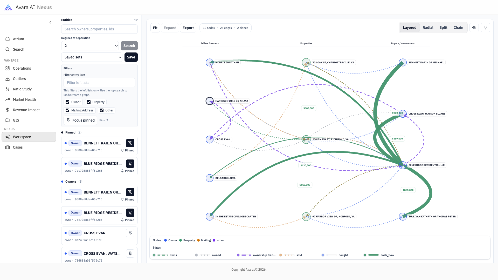 Avara turns scattered filings into a single, navigable flow of funds, automatically mapping who-benefited relationships and elevating the few patterns that usually hide the risk, each one backed by verifiable source links.