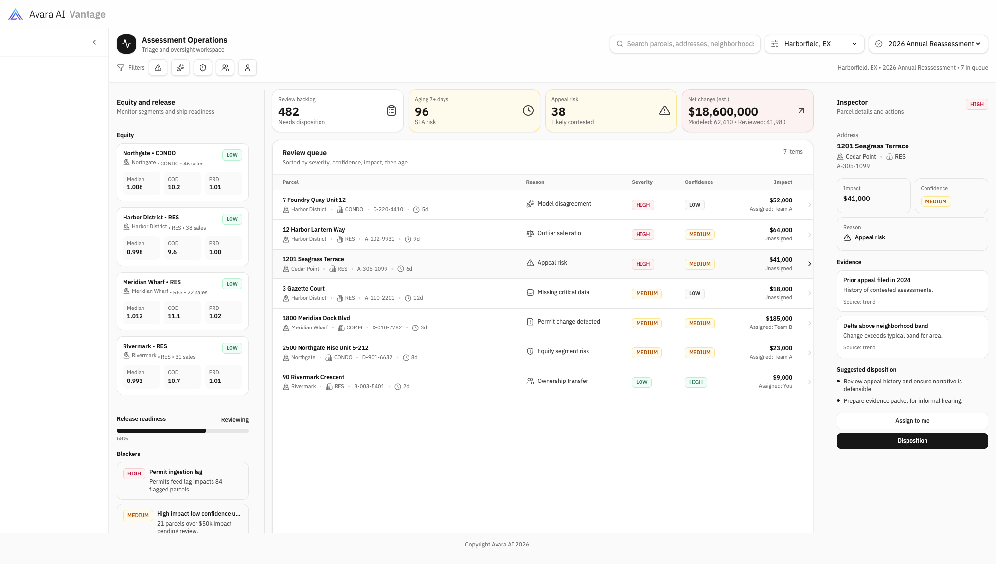 Valuation workflows built for review, appeals, and equalization. Outputs retain evidence and context so teams can explain the result, not just present it.